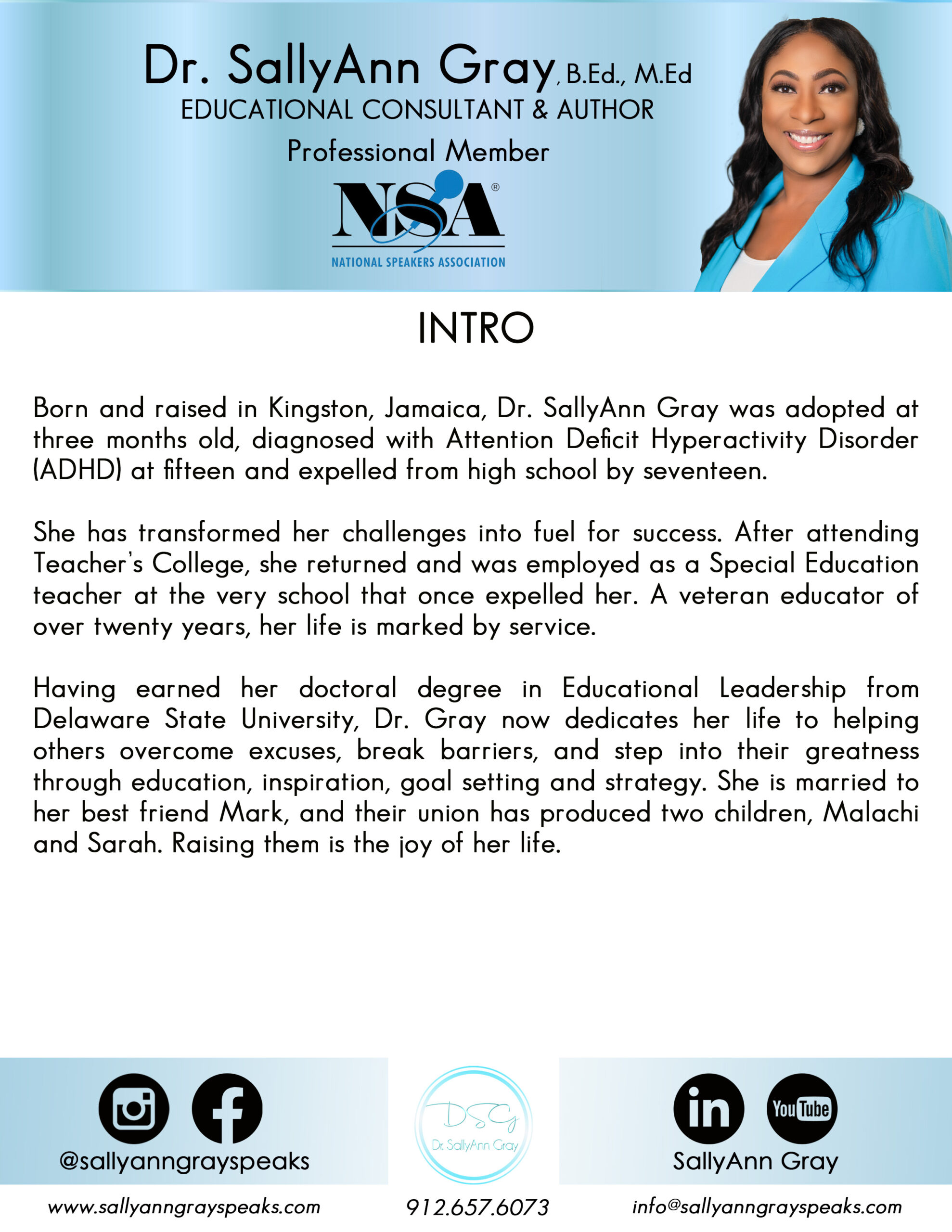 Today, Dr. SallyAnn Gray uses her life story as a living blueprint of possibility, inspiring countless individuals to leave behind excuses, break through limitations, and step boldly into their own greatness. Whether in classrooms, boardrooms, or global stages, her mission remains clear: to serve humanity by empowering others to rise above their circumstances and claim the extraordinary life they deserve.